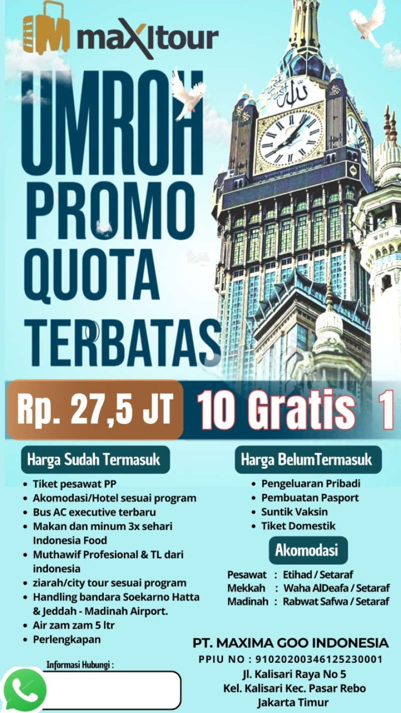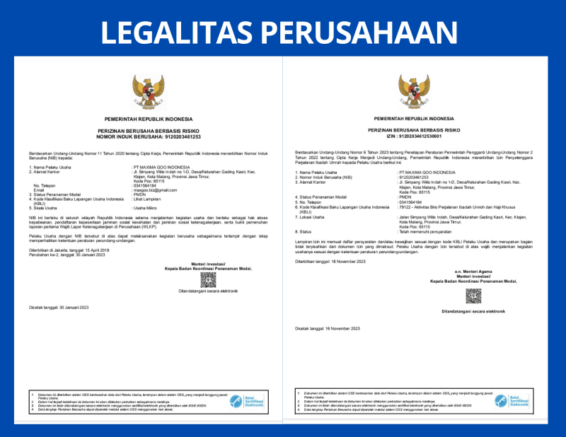 Perkenalkan kami dari PT Maxima Goo Indonesia (Maxima Tour) merupakan perusahaan yang bergerak di bidang jasa paket perjalanan ibadah Umrah dan Haji (Full Package service) yang mana telah banyak memberangkatkan jamaah Umrah di Indonesia. PT. Maxima Goo Indonesia dengan izin dari KEMENAG RI No 91202034612530001 dan berkembang pesat dari tahun ke tahun. PT Maxima Goo Indonesia menyediakan full package umroh, termasuk Hotel, Transportasi, Handling (Servis penjemputan dan kepulangan di Airport Jakarta-Jeddah-Makkah-Madinah Jakarta ), sehingga jamaah merasa aman dan nyaman selama menunaikan Ibadah Umrah. PT Maxima Goo Indonesia juga melayani jasa pengurusan Visa Umrah, Ticketing, Land Arranggement ( LA ) dan Wisata Internasional. Sampai saat ini kami telah mengeluarkan ribuan Visa Umrah dan Alhamdulillah semua keberangkatan dan kepulangan Jemaah Umrah sesuai dengan jadwal yang telah ditentukan. Kami juga menyediakan tiket umrah berbagai Airlines sesuai permintaan dengan harga yang kompetitif.