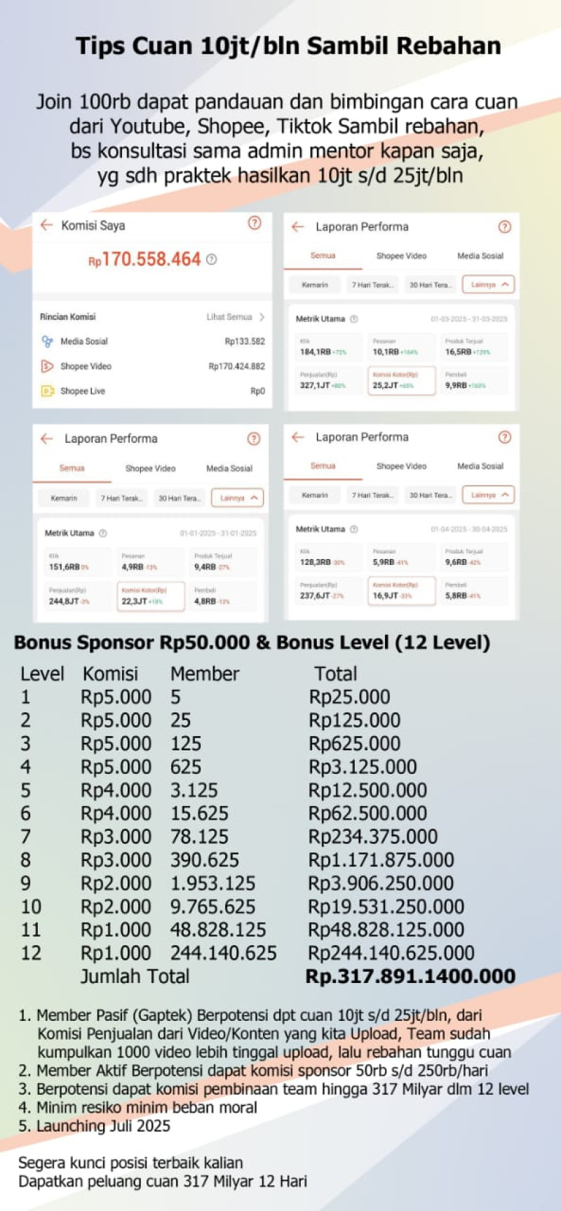 Jika temen" menduplikasikan ajak 5 orang sampai kedalaman 12, temen" berpotensi dpt penghasilan hingga 317 Milyar